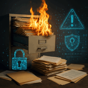 Primul risc major este pierderea sau deteriorarea documentelor. Hârtia este un suport fragil, susceptibil la factori de mediu precum umezeala, focul sau dăunătorii. O arhivă poate fi compromisă în totalitate în urma unui incendiu sau a unei inundații, iar recuperarea datelor devine imposibilă.
